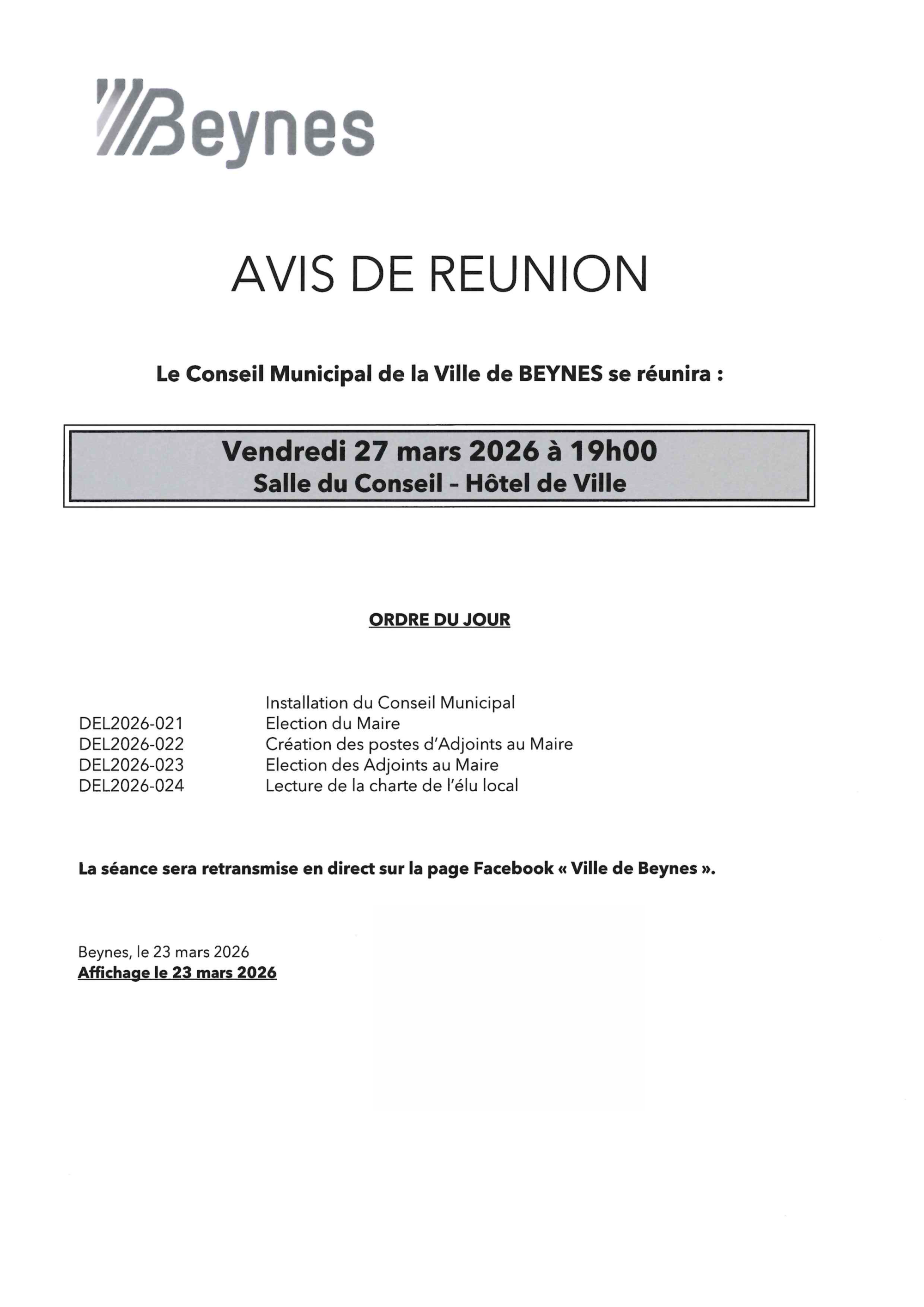 La séance sera retransmise en direct sur la page Facebook de la Ville de Beynes.