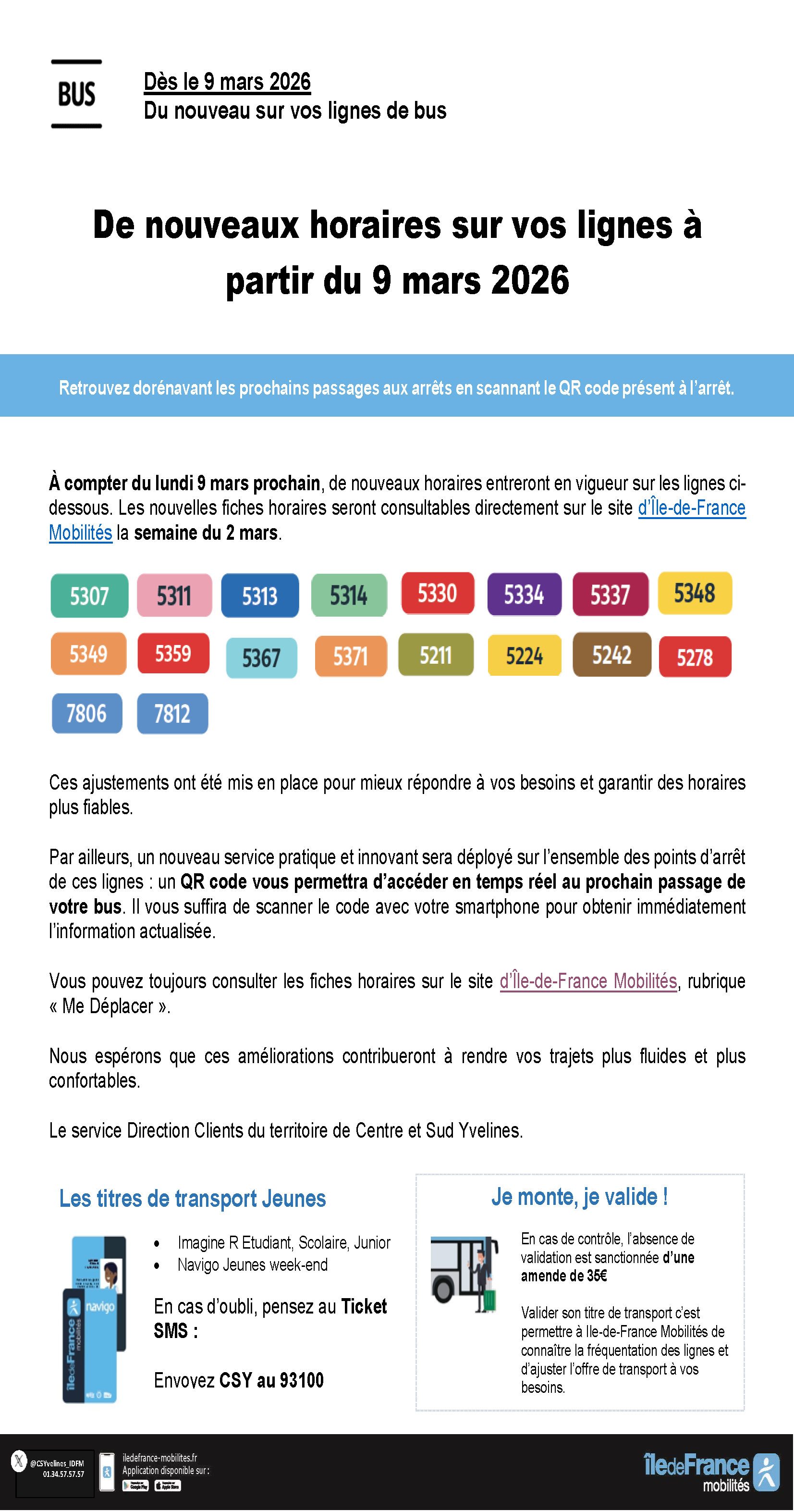 À partir du 9 mars 2026 : Changement d'horaires Transdev sur plusieurs lignes de bus du Centre et Sud Yvelines ! Cliquez pour plus d'infos.
